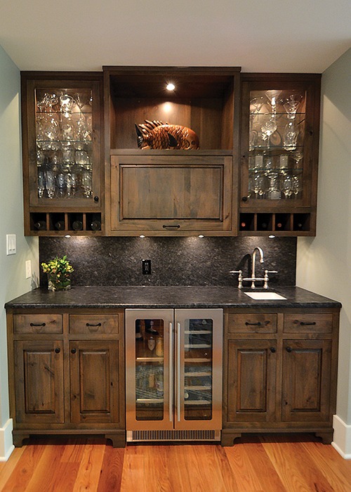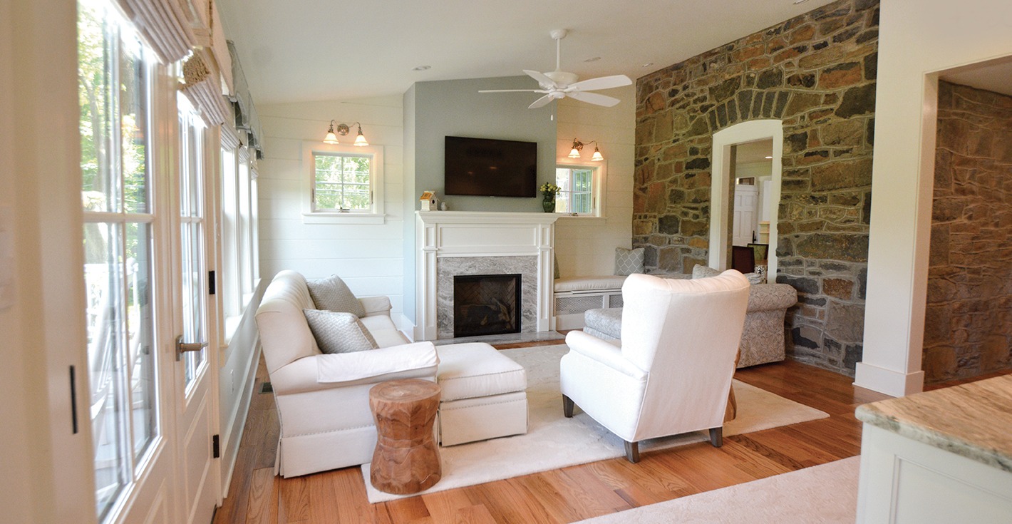 This original, historic stone home in Upper Bucks County was renovated and expanded by J.R. Maxwell Builders in such a way that the new and the old accentuate each other. Stone facades on the exterior are inspired by the stonework used in the original structure, and the original stonework is incorporated throughout the interior of the addition as well. A new master bedroom and bath, kitchen, living area, garage and lower office and guest area were all a part of this extensive addition. Custom millwork and stairs by Mink Run Millwork complemented the renovated and newly built areas.
